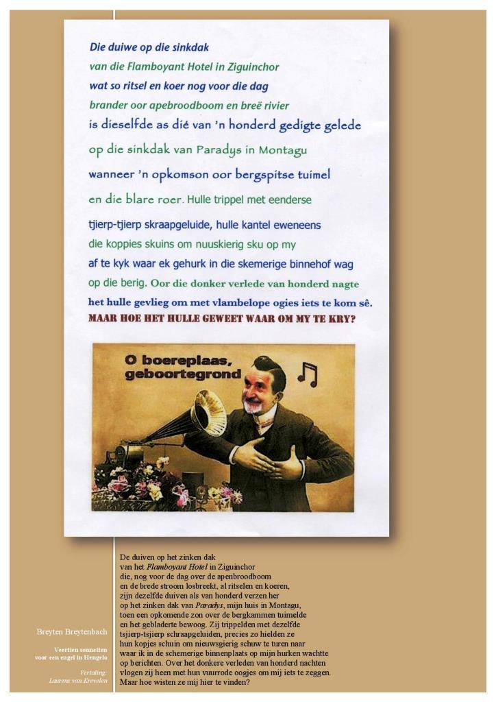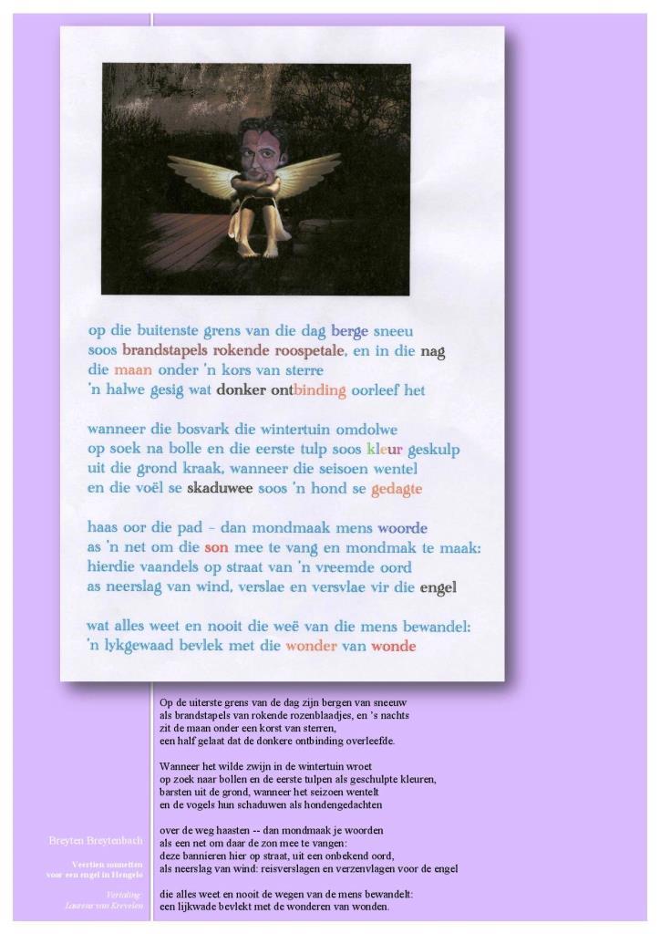 Onderdelen van die manifestatie Raakruimtes waren onder andere een omvangrijke expositie met schilderijen van Breytenbach, een avond vol Zuid-Afrikaanse poëzie en muziek in de schouwburg, een sokkeltentoonstelling hier met een keuze uit Breytenbach’s rijke poëzie-oeuvre, plus de grote verrassing: de ‘veertien sonnette vir ’n engel in Hengelo’ die alle veertien in zeer groot formaat op veertien blinde muren in de stad waren geplakt en zo een paar maanden een poëziespeurtocht vormden. Met deze wel heel bijzondere sonnettencyclus toonde de bescheiden Breytenbach zijn grote dankbaarheid voor de manifestatie te zijner ere op buitengewoon originele wijze.
