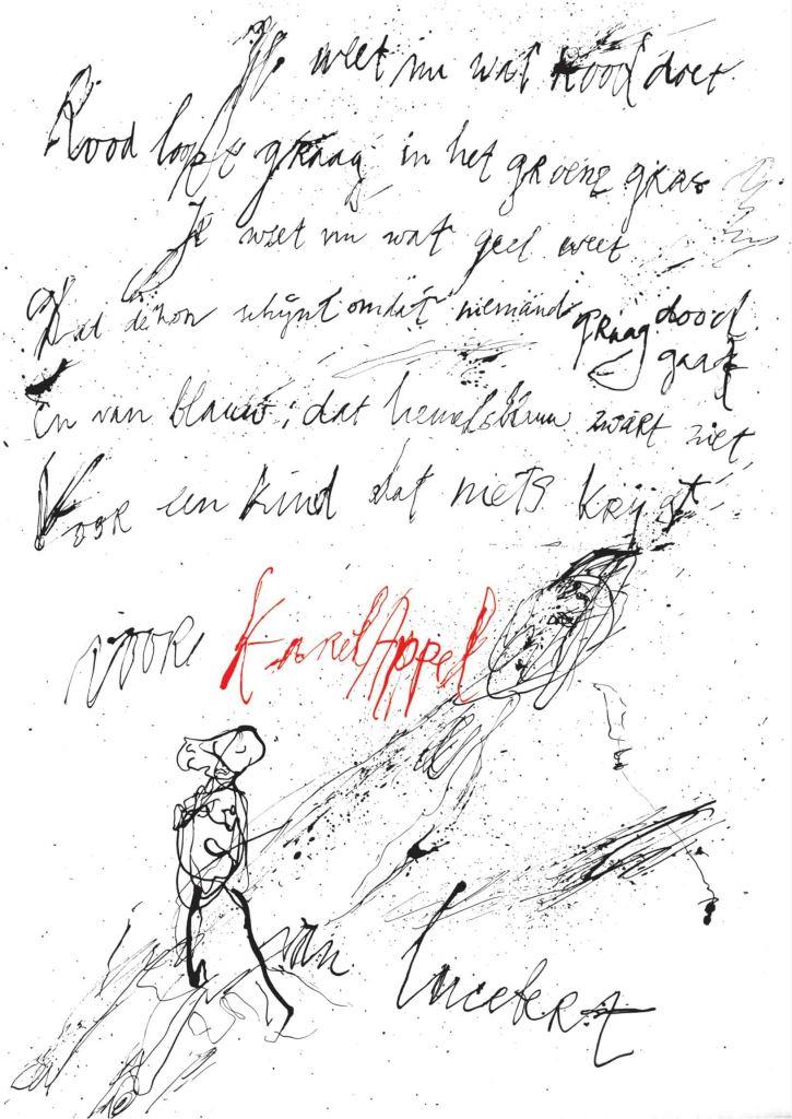 Ik wil eindigen met enkele, aan Lucebert opgedragen gedichten die door twee bevriende kunstenaars geschreven zijn naar aanleiding van het overlijden van Lucebert op 10 mei 1994. Wellicht wat onverwacht nam Karel Appel bij die gelegenheid de pen ter hand en schreef: dat de stem van een engel onze planeet had verlaten / en teruggekeerd is / naar de eeuwige ruimte van de geest / waar hij zo vertrouwd mee was.